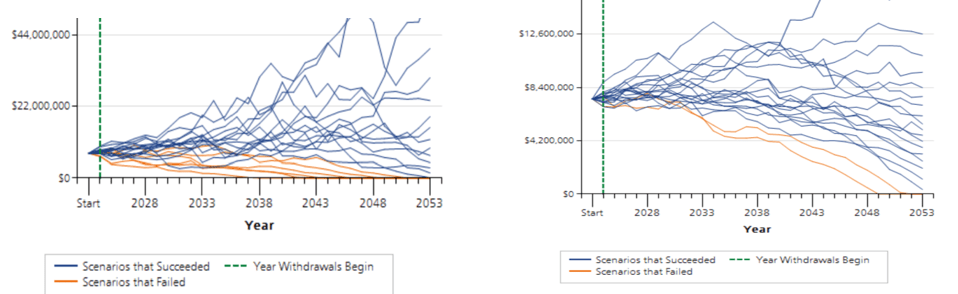 Here’s a simple example: you are a risky investor with a very high risk tolerance. Unbeknownst to you, your portfolio could not support your lifestyle if the stock market crashed (it has a lower risk capacity). How would you figure this out before its too late? In short – a little bit of math. Adding in some lifestyle assumptions, the below charts show that in this case 100% stock is less likely to have a successful retirement than owning only 30% stock. On the left, the portfolio survives 68% of the time, on the right, 88%.