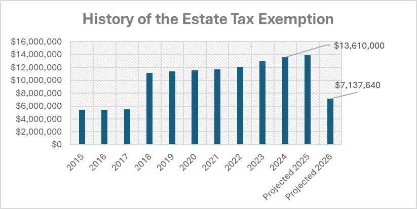 Figure 1: The exemption amount is scheduled to drop significantly in 2026. Lower exemption = Bad