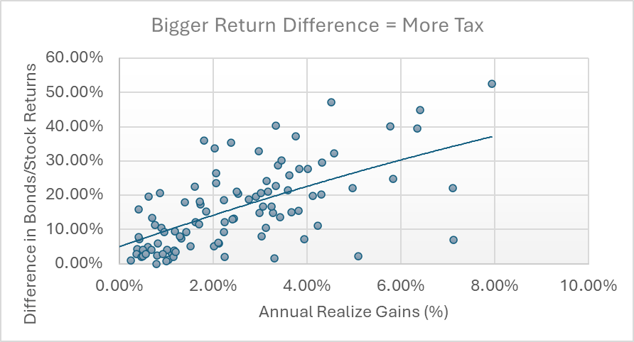 2) Big return differences (not combined portfolio return) between securities cause abnormally high tax years. In other words, stock being up and bonds being down triggers more portfolio trades than when both stocks and bonds are up.