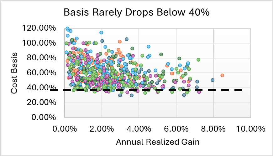 3) Unexpectedly, the cost basis of the accounts seemed to find a floor at 40%. In other words, annual rebalancing keeps taxes from getting too out of hand. Also, there is only a weak relationship between a mature account and high tax. Accounts with big unrealized gains do not necessitate big taxes.