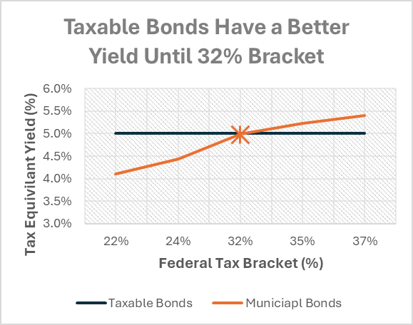 Assumptions: 5% taxable Bond; 3.2% Municipal. Credit quality or other characteristics not taken into account. 0% state income tax. NII tax included beginning 24% bracket.